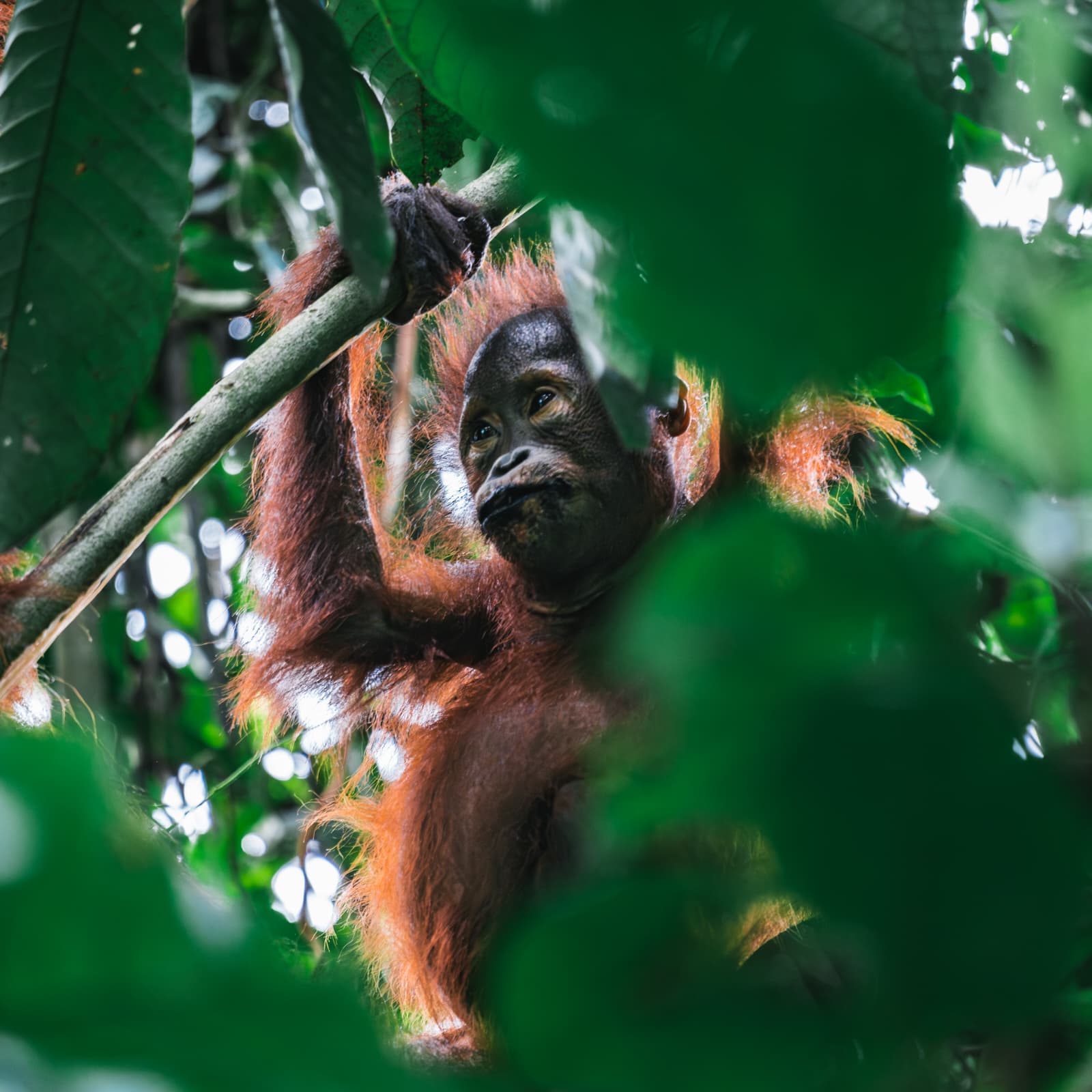 Orangutans are known as gentle and intelligent forest dwellers. They spend most of their lives high in the trees, foraging for fruits, building nests, and caring for their young with remarkable tenderness.